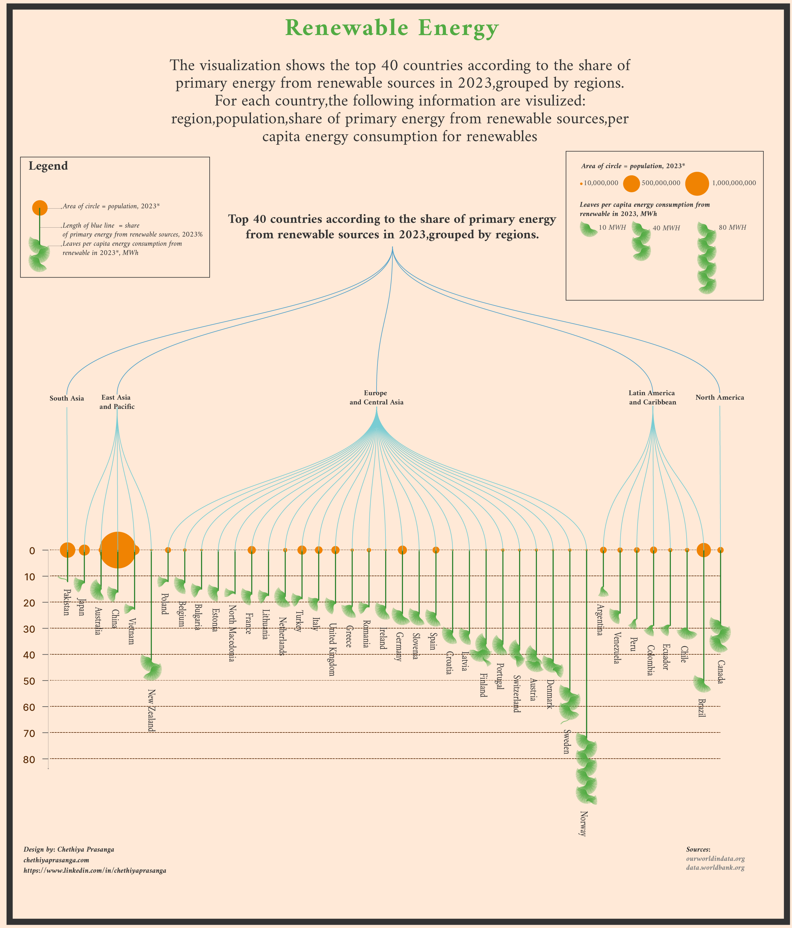 Each leaf in the visualization represents the per capita renewable energy consumption for a specific country or region in 2023. The number of leaves corresponds to the amount of energy consumed per person, measured in MWh. For example:A country with high per capita renewable energy consumption will have more leaves.