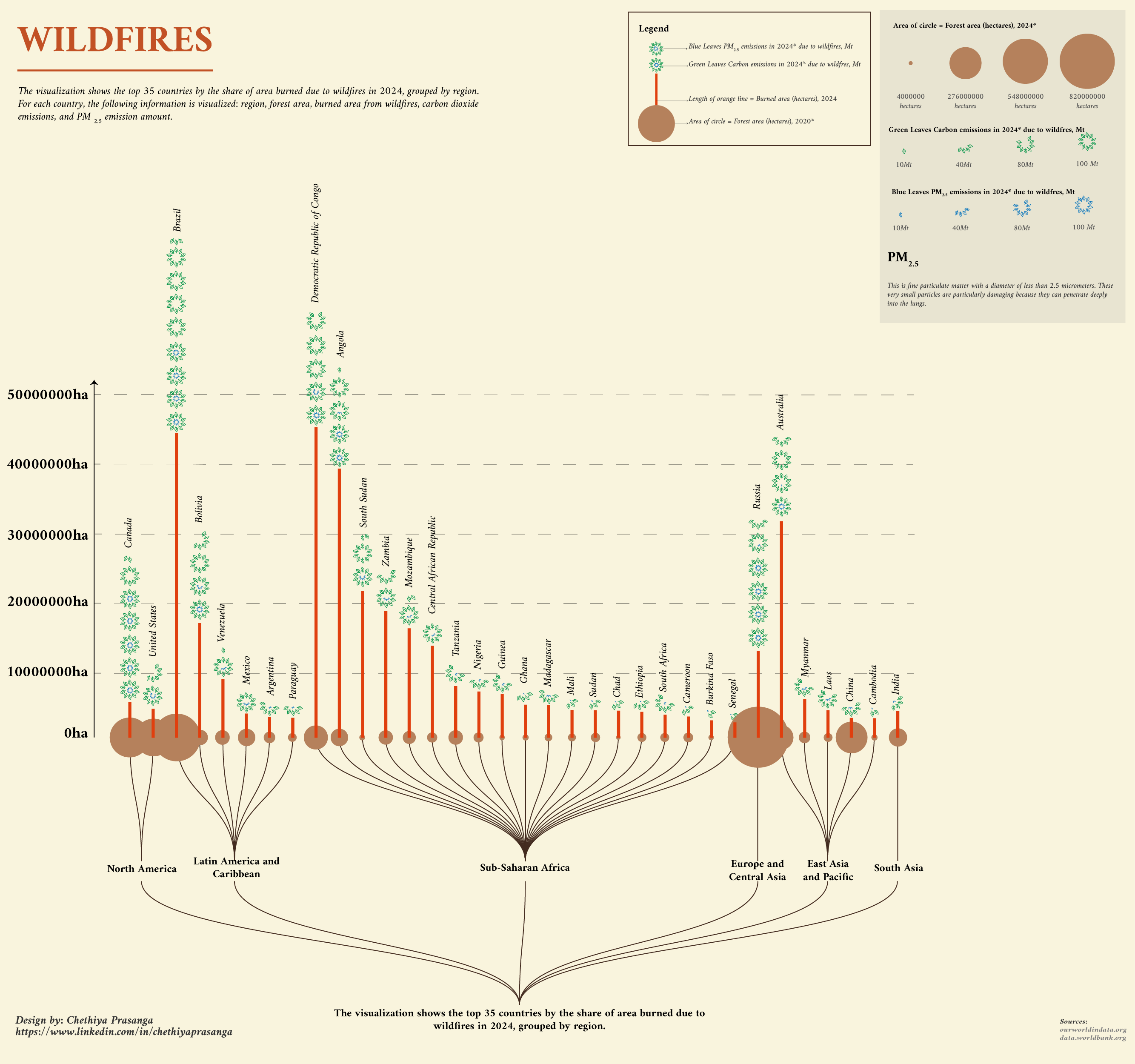 The length of the orange line attached to each circle represents the total area burned due to wildfires in 2024, measured in hectares. For example: Brazil: 5,430,000 hectares burned Democratic Republic of Congo: 2,760,000 hectares burned Australia: 820,000 hectares burned Green Leaves = Carbon Emissions in 2024 Due to Wildfires (Mt)* The number of green leaves corresponds to the amount of carbon dioxide (CO₂) emitted due to wildfires in 2024, measured in metric tons (Mt). For example: 10 Mt: 1 leaf 40 Mt: 4 leaves 80 Mt: 8 leaves 100 Mt: 10 leavesBlue Leaves = PM₂.₅ Emissions in 2024 Due to Wildfires (Mt)*